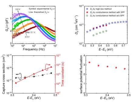 团队提出对H终端进行水蒸汽氛围退火形成OH终端金刚石(无二维空穴导电层形成)来制备MOS电容,将界面态密度降低至1012cm−2eV−1量级(如图2所示),且首次采用高温高低频法表征了界面陷阱随能级位置的变化;并且进一步使用电导法,首次考虑缺陷具有连续能级以及界面电荷不均一造成的表面势波动这些因素,对界面陷阱进行了定量分析:通过表面势波动随能级位置的变化判断出界面陷阱的类型(施主型),提取了界面陷阱捕获横截面积(如图3所示),对界面态起源进行了科学猜想。基于该OH终端形成技术我们制备了反型p沟道MOSFET,迁移率较之前有所提升,可达50 cm2V−1s−1,但仍不能满足需求,亟待大幅提高。