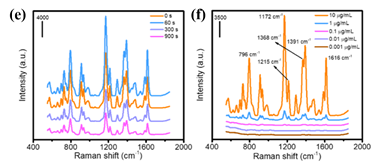 (a)自组装技术掩膜版制备,(b)图形化转移硅纳米柱结构制备,(c)磁控溅射贵金属纳米粒子沉积SERS基底制备,(d)R6G测试,(e)硅纳米柱SERS基底NDM不同修饰时长后MG增强性能测试,(f)最优修饰后MG性能测试。