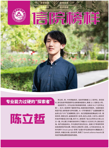 他刻苦学习,对专业知识有崇高的热爱,以绩点94.37位列专业第一,在大二就获得了国家奖学金。他是校级优秀团员,也是校级优秀团干部。他积极参与学科竞赛,大一开学便斩获了“全国数媒赛”的金奖以及“ICPC”区域赛铜奖。至今,他已获国家级竞赛金奖六项、银奖四项、铜奖五项,省部级奖项十余项。他沉心科研,力求为人类科学的进步贡献自己的力量。他于大二便发表了自己主导的北大核心论文一篇,并以第三作者的身份参与了两篇SCI论文的工作。