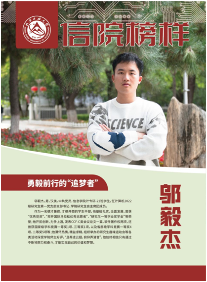 作为一名德才兼修、才德并懋的学生干部,他基础扎实、全面发展,曾获“优秀党员”、“郑开国际马拉松优秀志愿者”“研究生一等学业奖学金”等荣誉;他开拓创新、力争上游,发表CCF-C类会议论文一篇,软件著作权两项,还曾获国家级学科竞赛一等奖1项、三等奖1项,以及省部级学科竞赛一等奖4项、二等奖5项等;他满怀热情、精益求精,组织举办的研究生趣味运动会等各类活动深受学院师生好评。“且养凌云翅,俯仰弄清音”,他始终相信只有通过不断地努力和奋斗,才能实现自己的价值和梦想。