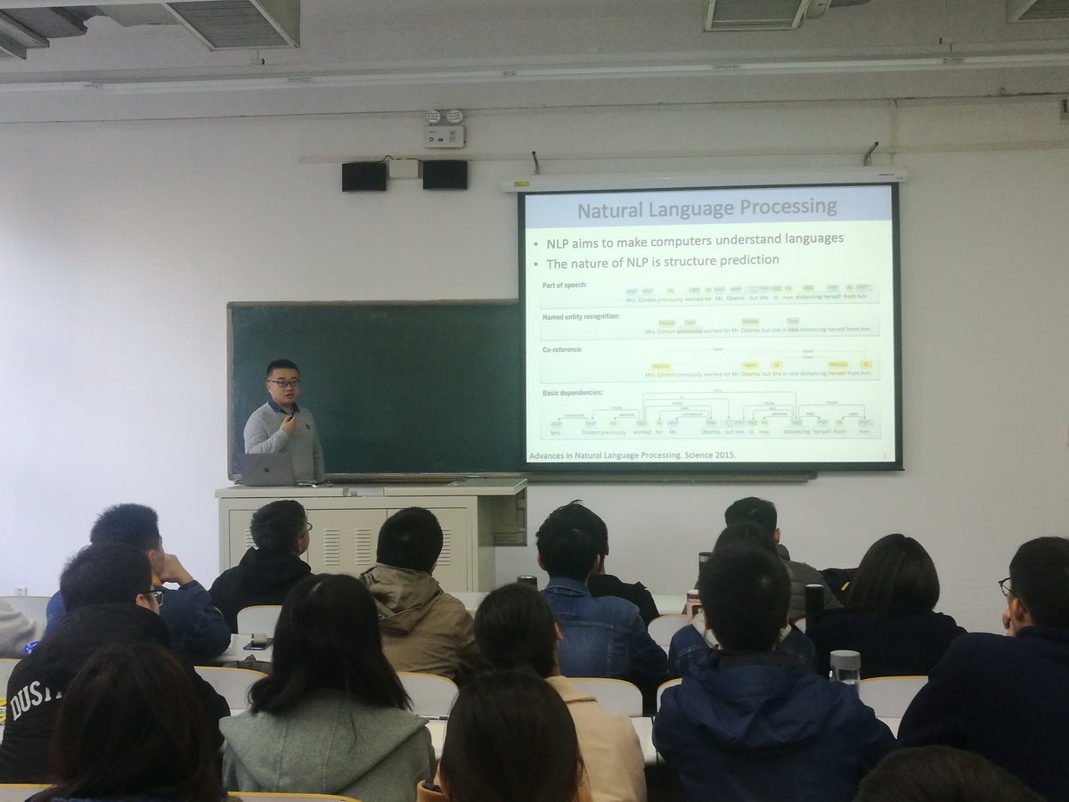 报告围绕HowNet(知网)展开,提出了基于义原的知识表示新方法,深入分析了如何利用知识指导深度学习,并分享了这些方法的最新研究进展。与会师生围绕知识表示、义原以及深度学习等问题展开了热烈的讨论。