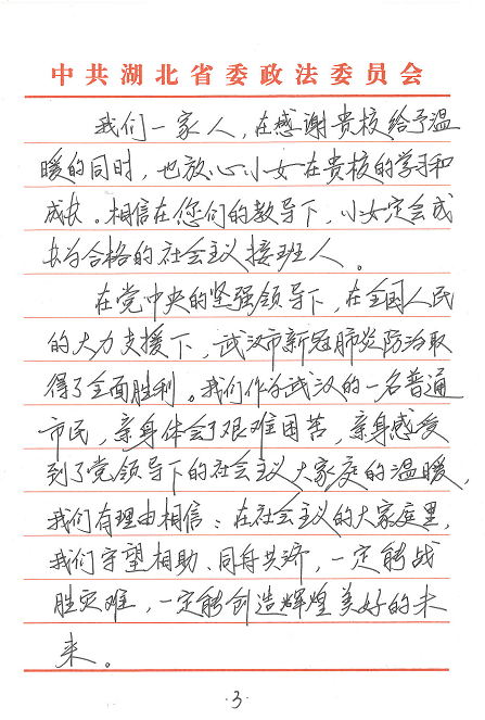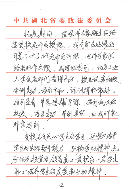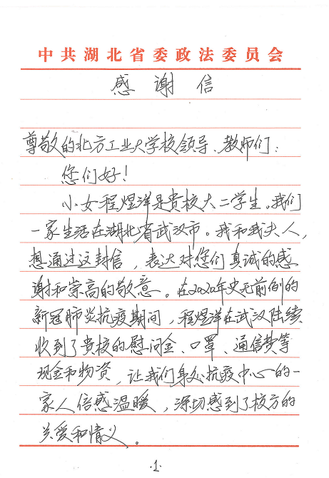 “小女程煜洋是贵校大二学生。我们一家生活在湖北省武汉市。我和我的夫人,想通过这封信,对您们表达真诚的感谢和崇高的敬意。在2020年史无前例的新冠肺炎抗疫期间,程煜洋陆续收到了贵校的慰问金、口罩、通信费等现金和物资,让我们身处抗疫中心的一家人倍感温暖,深切感到校方的关爱和情义……”。这是4月3日澳门十大信誉网赌大全辅导员杨和家收到的一封来自通信18-3班程煜洋同学家长的感谢信,全文600余字,饱含了身处武汉抗疫中心的一家人对学校学院在疫情期间给予关心关爱的深切感激之情。
